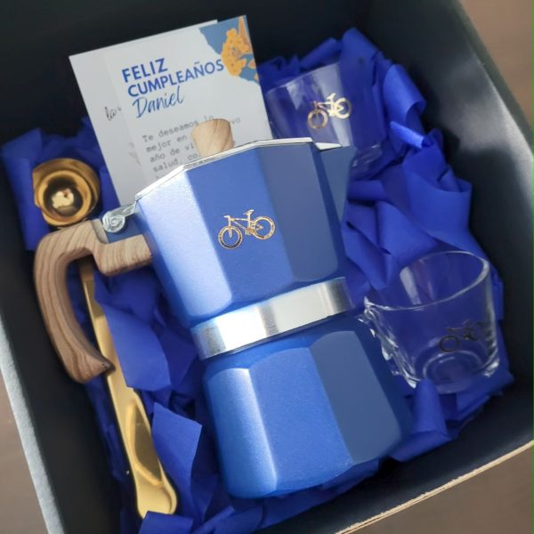Celebra la amistad, el cariño y los momentos compartidos con este set pensado para los que disfrutan las cosas simples de la vida. Incluye una cafetera moka azul con diseño exclusivo, dos tazas de vidrio grabadas, una cuchara medidora dorada y una tarjeta personalizada para dedicar con estilo.