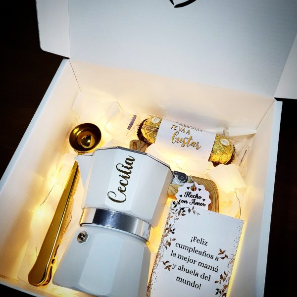El Con Cariño Box es ese detalle que derrite corazones. Incluye una elegante moka pot blanca, una taza dorada y deliciosos Ferrero Rocher, con decoración iluminada: una combinación pensada para decir “te mereces algo bonito”. Ideal para sorprender a mamá, abuelita o esa persona especial con un momento lleno de ternura y estilo.