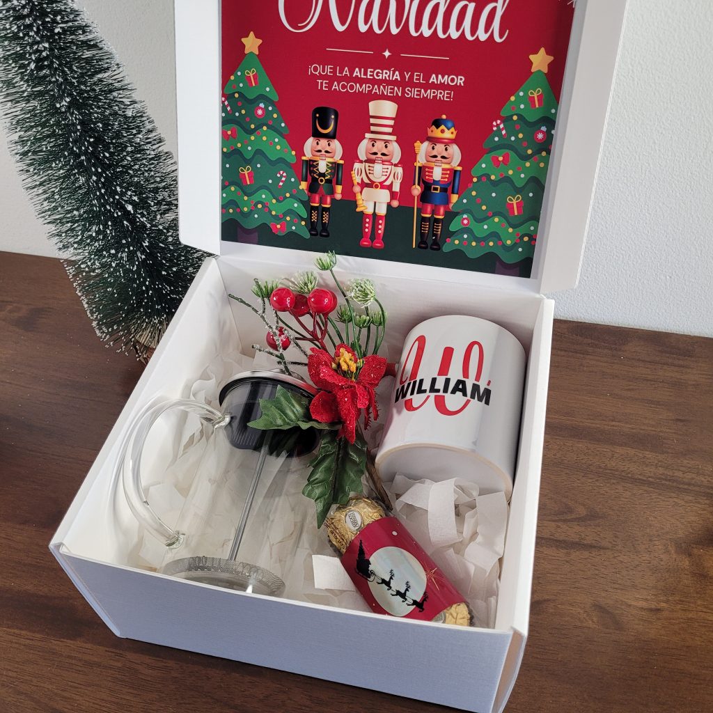 Set Elegancia y Café: Prensa Francesa Transparente, Taza Personalizada y Bombones Ferrero